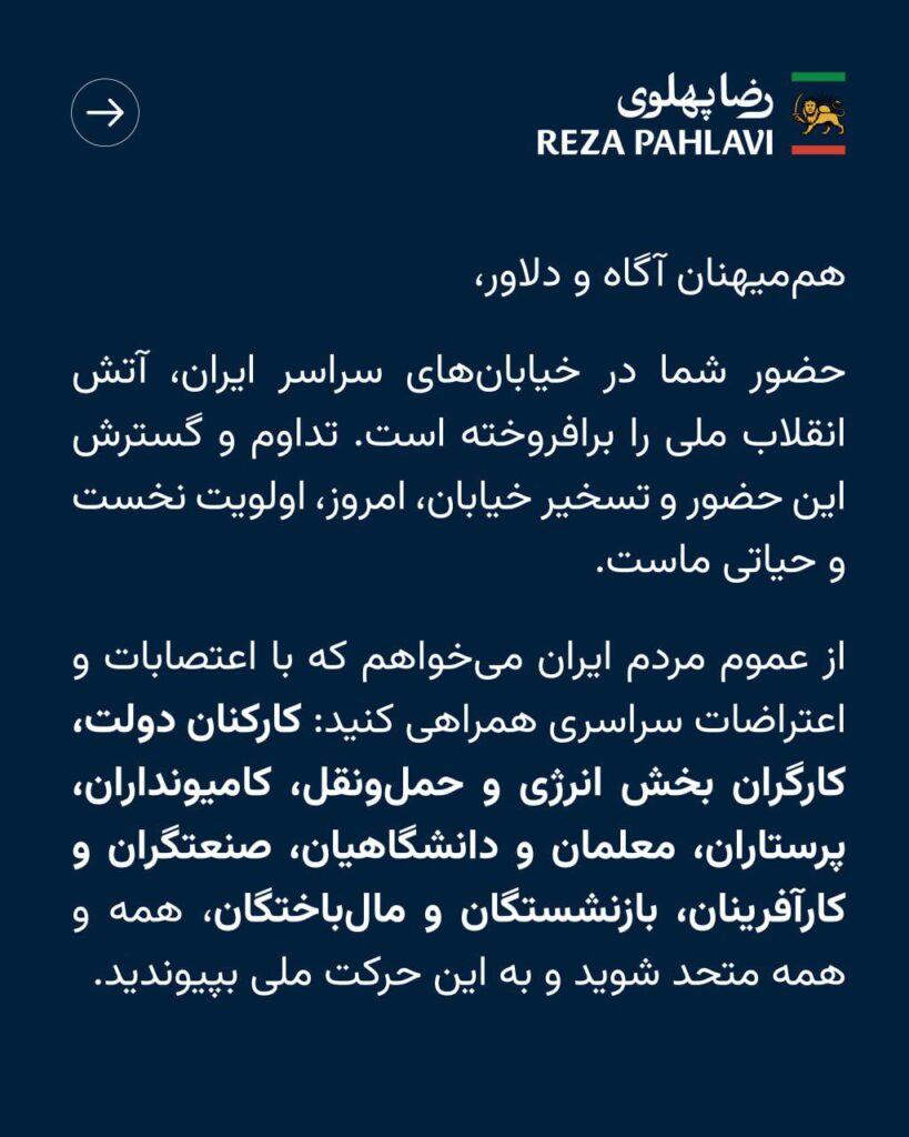 یکی از مهم‌ترین بخش‌های این پیام، دعوت صریح به اعتصابات سراسری است. شاهزاده رضا پهلوی با نام بردن از اقشار مختلف از کارکنان دولت و کارگران انرژی و حمل‌ونقل تا پرستاران، معلمان، دانشگاهیان، صنعتگران و بازنشستگان نشان داد که این حرکت، محدود به یک قشر یا گروه خاص نیست.