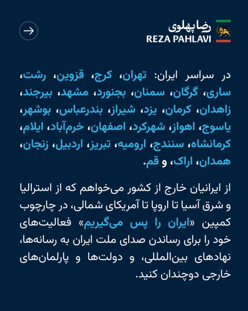 ذکر نام ده‌ها شهر از تهران تا زاهدان، از تبریز تا اهواز، از شیراز تا بندرعباس، تنها یک فهرست جغرافیایی نبود. این بخش از فراخوان شاهزاده رضا پهلوی پیامی روشن داشت: ایران یکپارچه است و هیچ نقطه‌ای از این مبارزه ملی جدا نیست.