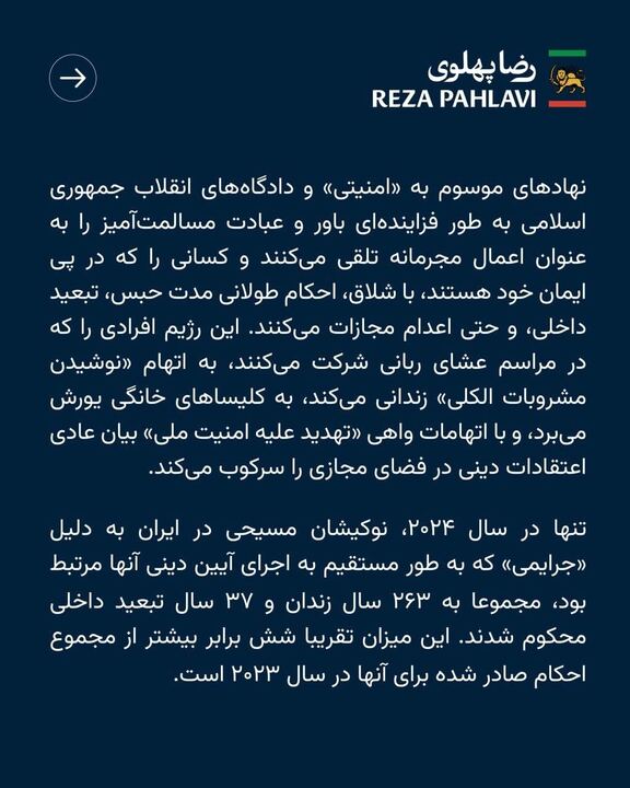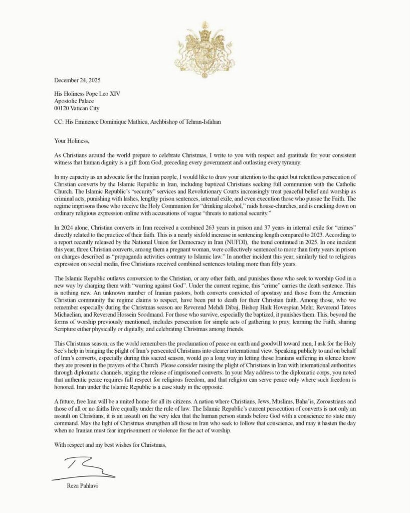 شاهزاده رضا پهلوی در این نامه، با لحنی سنجیده و مسئولانه، توجه رهبر کلیسای کاتولیک را به وضعیت دشوار مسیحیان تحت آزار در ایران جلب کرد؛ موضوعی که سال‌هاست در گزارش‌های حقوق بشری مطرح می‌شود، اما کمتر در این سطح نمادین و مستقیم بیان شده است.